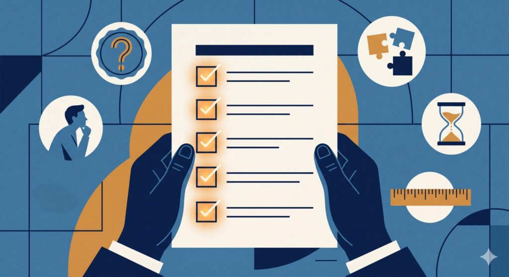ログラインを書いた後、それが「機能するログライン」かどうかを判定する基準が必要です。以下の5つの問いに答えることで、自己診断できます。
