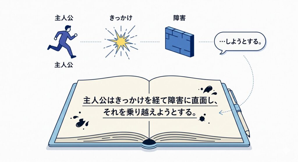 物語の冒頭で主人公が動き出す出来事を一語で表します。「家族を失う」「追放される」「異世界に転生する」「謎の依頼が届く」といった形です。このきっかけが具体的なほど、読者は物語のスタートラインを把握しやすくなります。