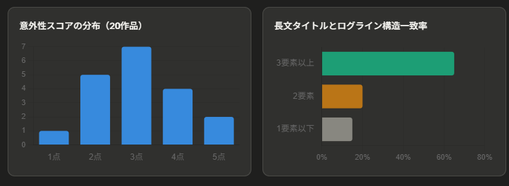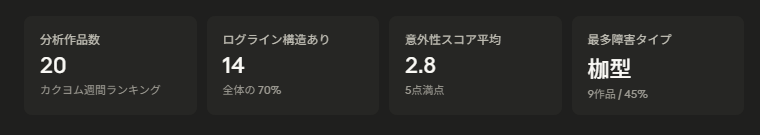 カクヨム週間ランキング上位20作品のあらすじとタイトルを対象に、のべもあ編集部がログラインの構成要素を抽出し、「障害タイプの分布」「意外性スコア」「長文タイトルとのログライン要素一致率」の3軸で分析しました。