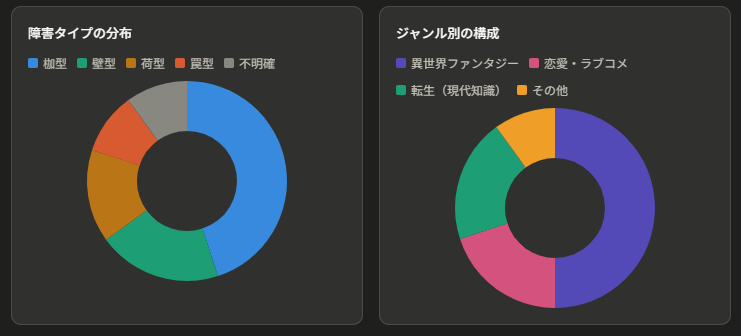 20作品を障害タイプ別に分類した結果、「枷型」が9作品(45%)で最多でした。枷型とは、主人公が直接破壊できないが回避や共存で対処する障害を持つ構造です。「追放されたが実力を証明していく」「最弱扱いされているが実は最強」「隠居したはずが巻き込まれる」といったパターンがこれにあたります。