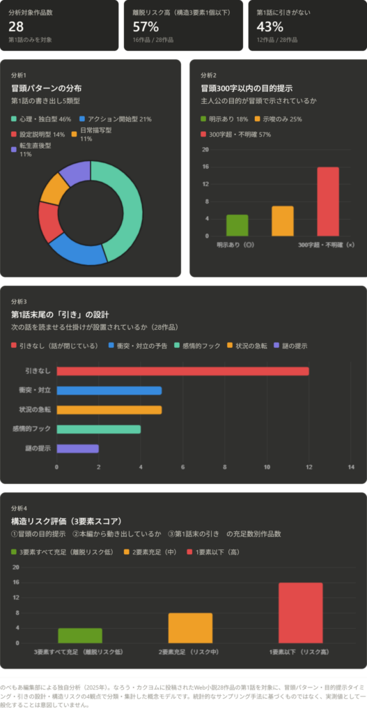 Web小説の書き方記事が「冒頭に主人公の目的を置け」「引きを設計しろ」と繰り返す一方で、実際の初心者作品でそれができているものはどれだけあるのか。のべもあ編集部では、なろう・カクヨムに投稿されたWeb小説28作品の第1話を対象に、冒頭パターン・目的提示のタイミング・引きの設計・構造リスクの4観点から分類・集計しました。