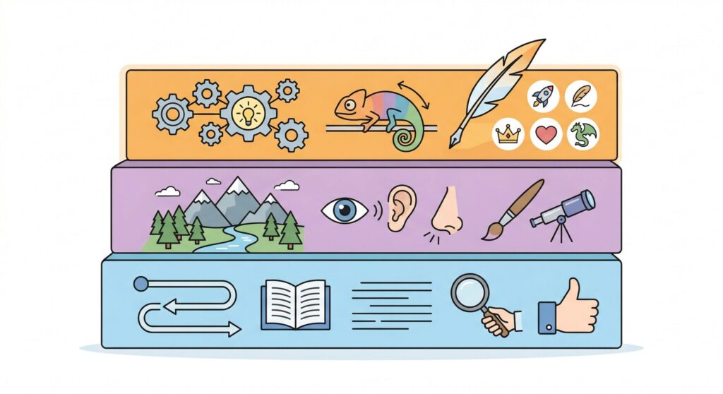 小説の「文章力」は、一つの能力ではなく、少なくとも三つの異なる技術層から成り立っています。多くの作家が「文章力がない」と感じるとき、実際にはこの三層のどれか一つが弱いだけであることが多いです。逆に言えば、問題の層を特定しない限り、どれだけ練習しても効果が出にくくなります。