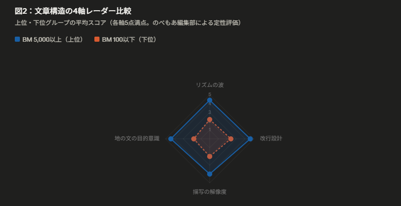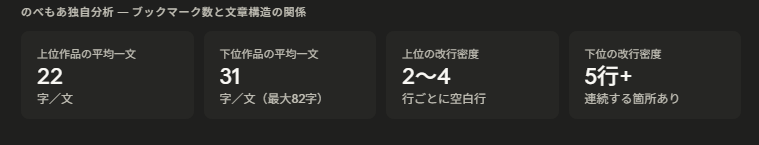 差が出たのは「波の設計」です。上位5作品では、短文→中文→短文という長さのリズム変化が意図的に配置されており、読者が文章を「泳いで読める」構造になっていました。一方、低ブックマーク作品の一部には、一文が80字を超える超長文と9字の短文が無計画に隣接する箇所が見られ、読者が文章のスピードを掴めないまま流れていく印象がありました。