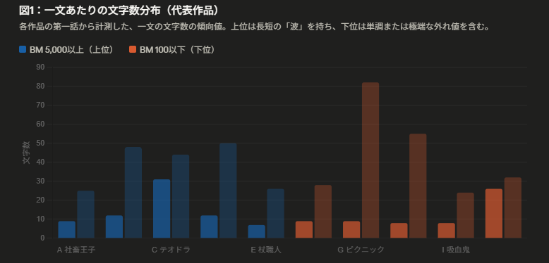 両グループの一文文字数を比較すると、単純な「短文かどうか」に明確な差はありませんでした。上位作品の中にも、「玄関に倒れ込み、そのまま意識を失った。」(17字)のような短文と、「豪奢なシャンデリアの下、大理石の床に跪いているのは、本日六歳になったばかりの少女、ミシェルだ。」(48字)のような中〜長文が共存しています。