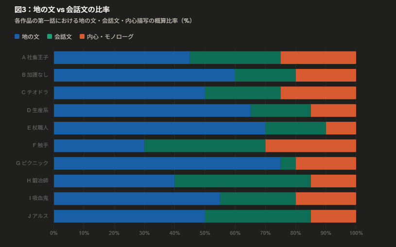 のべもあ編集部では、なろうに投稿された作品から、ブックマーク数5,000以上の作品5点とブックマーク数100以下の作品5点、計10作品の第一話テキストを対象に文章構造の分析を行いました。分析観点は「一文の平均文字数」「地の文と会話文の比率」「改行密度」「描写の解像度(感覚語・具体名詞の密度)」の4点です。