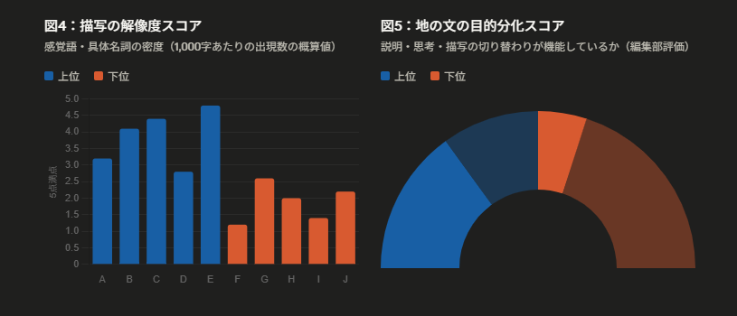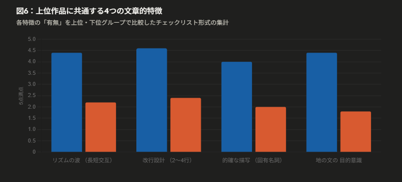 どちらも「読者が小説の世界に立てる場所がない」という結果になります。上位作品は描写の多さではなく、「読者がその場にいられる最低限の手がかり」を的確に置いている点で際立っていました。