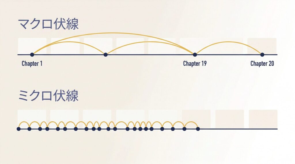 連載型Web小説では、長期伏線(マクロ伏線)だけでなく、数話以内で回収される短期伏線(ミクロ伏線)を各話に配置することが有効です。毎話ごとに読者は継続するかを判断するため、長期伏線だけでは中盤の離脱を防ぎにくくなります。1話あたり1〜2個の小さな仕込みと回収を繰り返す設計が、読者の継続率を安定させます。