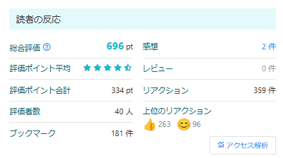 なろうのランキングは評価ポイントで決まります。ブックマークで2pt、作品評価の2~10ptの合計が作品の総合点になります。読者1人あたりの保持ポイント上限が12ptなので、それをどれだけ集められるかがランキングを駆けあがれるかに直結しています。