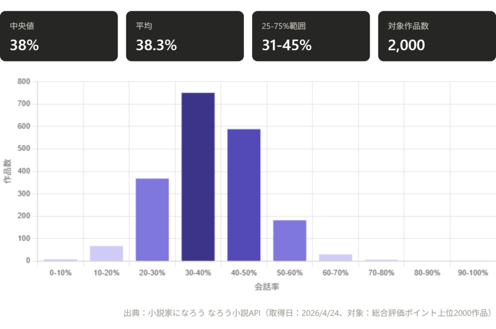 上位2000作品の会話率は中央値38%|分布の山は30〜40%台