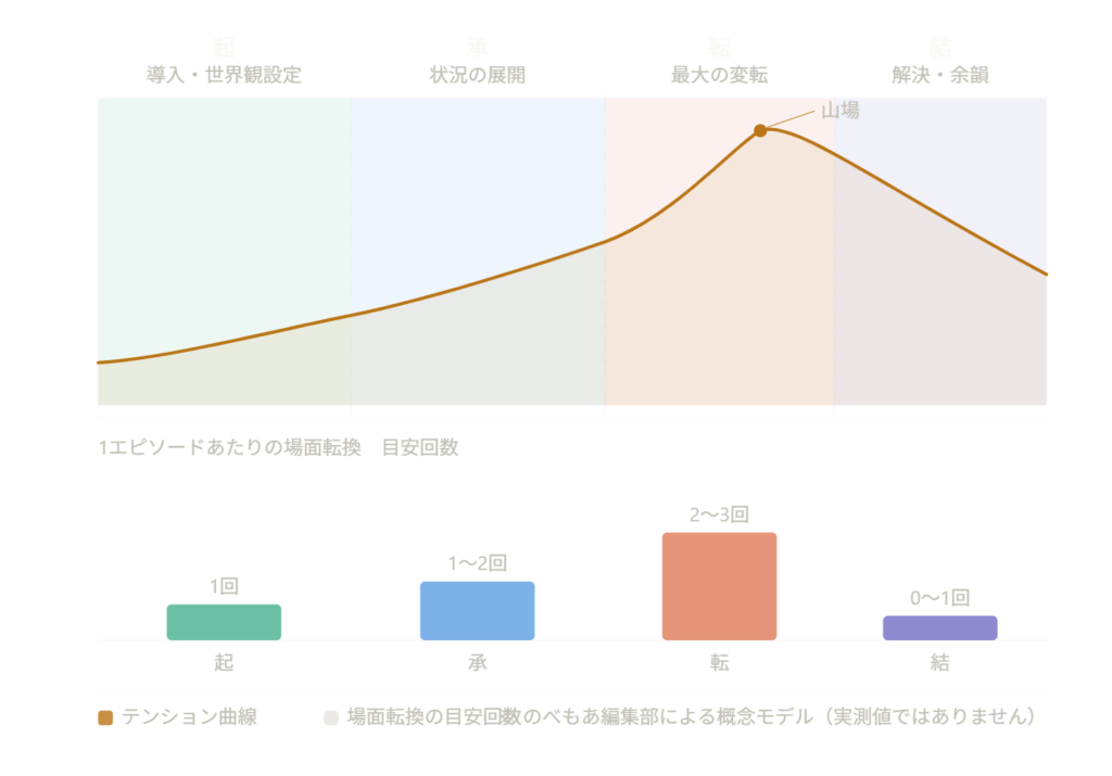 上の図は、物語のテンション曲線と各フェーズにおける場面転換の目安回数の関係を示したものです。4つのフェーズで密度が異なる理由を順に説明します。